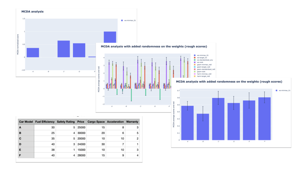In our case, there is a practical step forward because ProMCDA can collect information from the output of other tools. This includes things such as different normalization and aggregation methods, added stochasticity on the weights, but also that some of those criteria are not just a number, but are defined by a distribution, so they are uncertain. If you are curious about this, you can find more in-depth information in this article on ProMCDA.