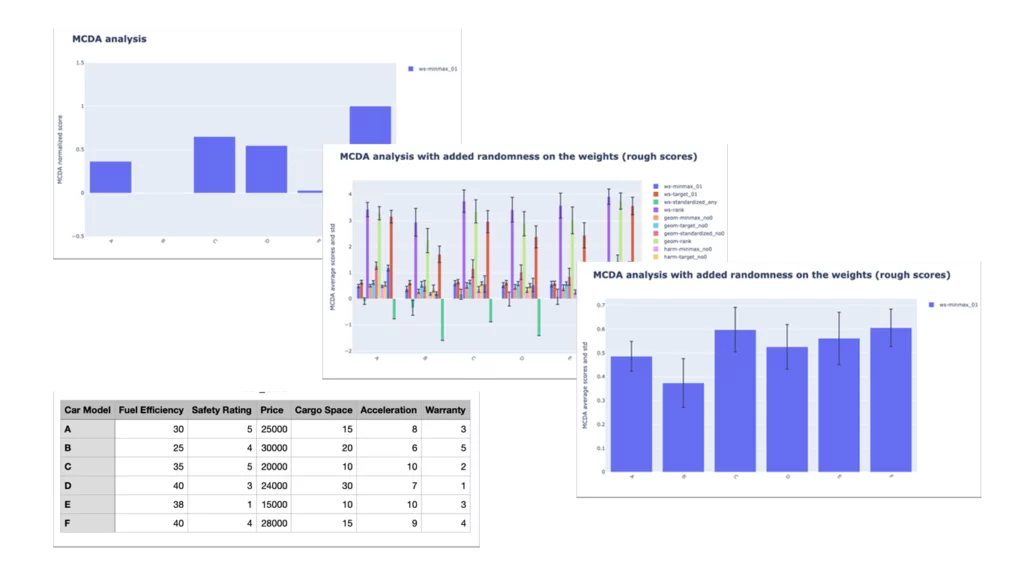 In our case, there is a practical step forward because ProMCDA can collect information from the output of other tools. This includes things such as different normalization and aggregation methods, added stochasticity on the weights, but also that some of those criteria are not just a number, but are defined by a distribution, so they are uncertain. If you are curious about this, you can find more in-depth information in this article on ProMCDA.